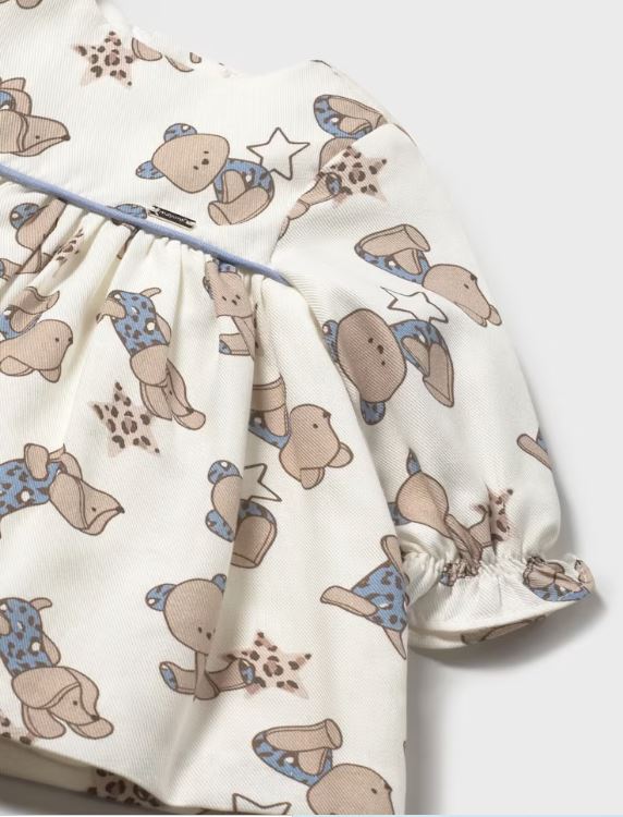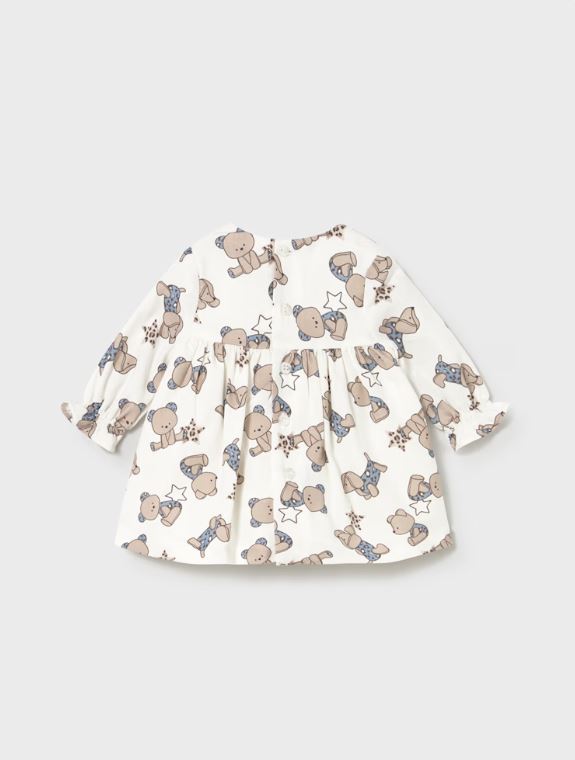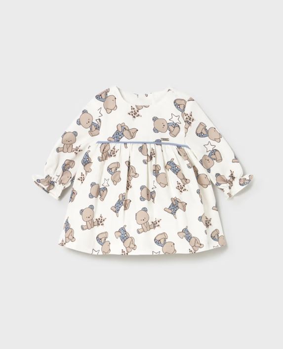 Vestito realizzato in un morbidissimo tessuto fantasia con orsetti ,foderato in cotone per renderlo particolarmente confortevole.